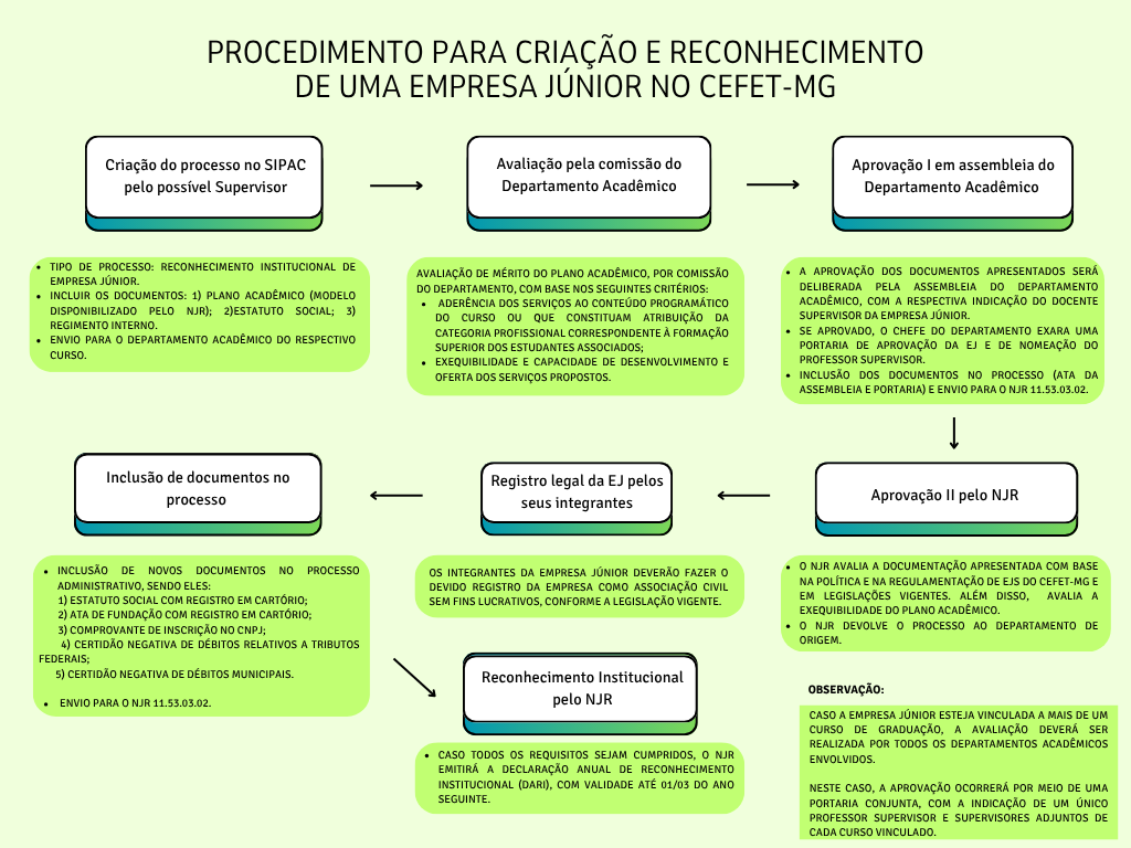 As normas orientadoras para a criação e reconhecimento de uma EJ na instituição estão disponíveis nos links abaixo. Além delas, temos dois fluxogramas específicos com os trâmites de criação (reconhecimento) e manutenção do reconhecimento de uma EJ que vão resultar na emissão da declaração de reconhecimento (DARI) pelo Núcleo de Empresas Juniores do CEFET-MG (NJr).