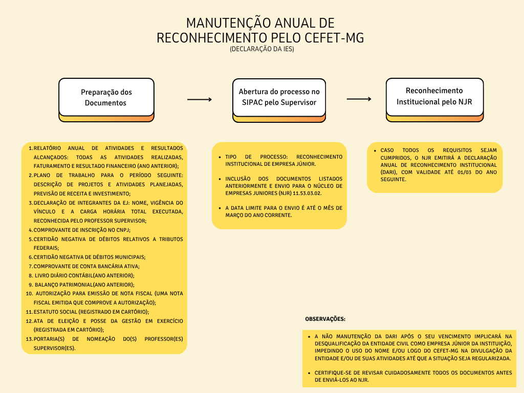 De acordo com a Regulamentação das Empresas Juniores (CEX 436/24), a manutenção do reconhecimento deve ser realizada anualmente para a emissão da Declaração Anual de Reconhecimento Institucional (DARI). A DARI é a declaração da IES, emitida pelo Núcleo de Empresas Júniores do CEFET – MG, que as EJ devem enviar à Brasil Júnior. Além disso, também é o documento necessário para cadastro de ações de extensão no âmbito das EJs no SIPAC